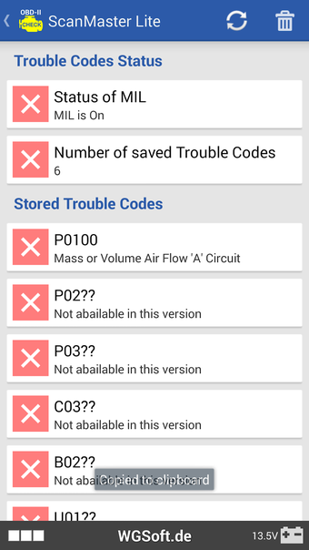 ScanMaster Para ELM327 OBD-2 ScanTool funciona en Android 9.0 y superior. La versión actual del software es la 5.3, y se puede ejecutar en inglés, alemán y ruso.